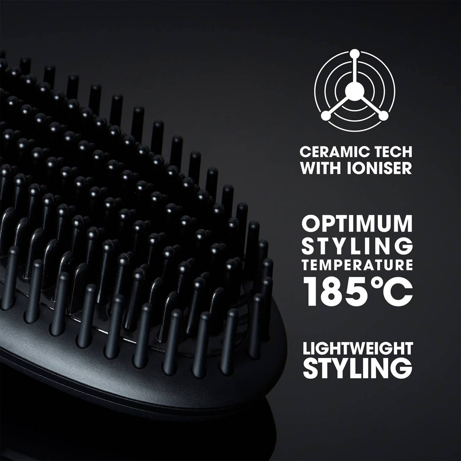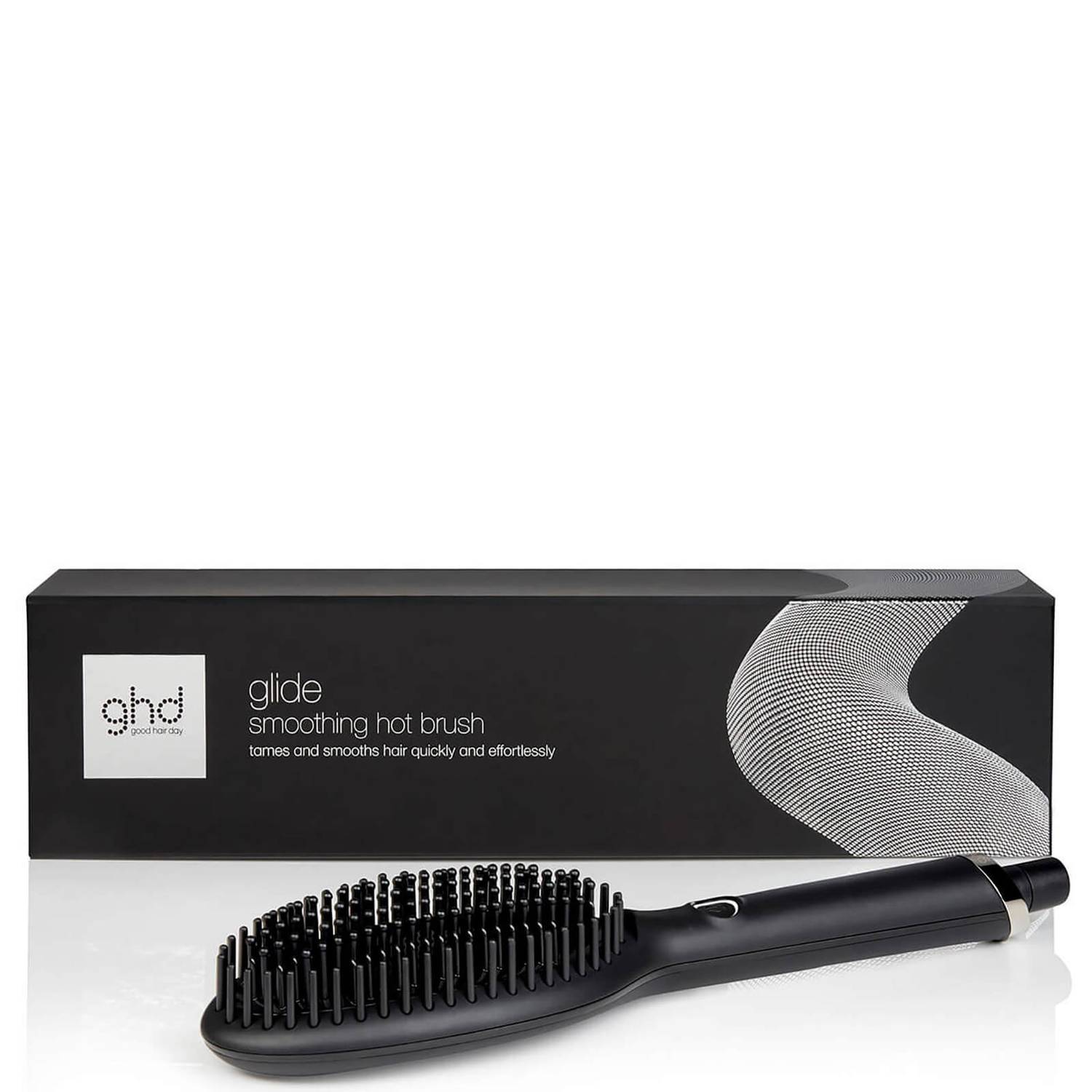 The holy grail of effortless and easy hairstyling tools, the Glide Hot Brush tames unruly lengths in a few quick strokes for a sleek ?n smooth finish. Suitable for all hair types, use this tool to detangle and shape your hair. Designed with ceramic technology and an anti-static ioniser, the brush has a uniform temperature to evenly straighten your hair and take frizz out of the equation. As with all of ghd?s heat styling tools, it maintains a research-backed optimum temperature of 185?C; cooler temperatures deliver poorer styling results while hotter ones can cause irreversible, unnecessary hair damage. The art of the brush lies with the mix of high-density bristles of varying lengths that glide through easily and style large sections at once, giving your hair natural movement that doesn?t fall flat. For total peace of mind, this tool will automatically enter a sleep mode after 60 minutes of non-use.