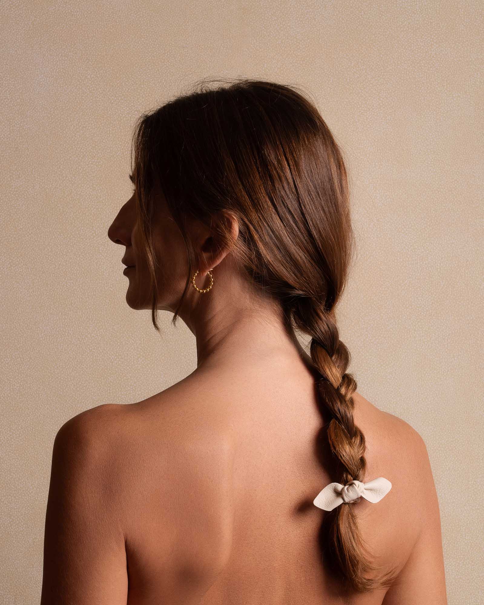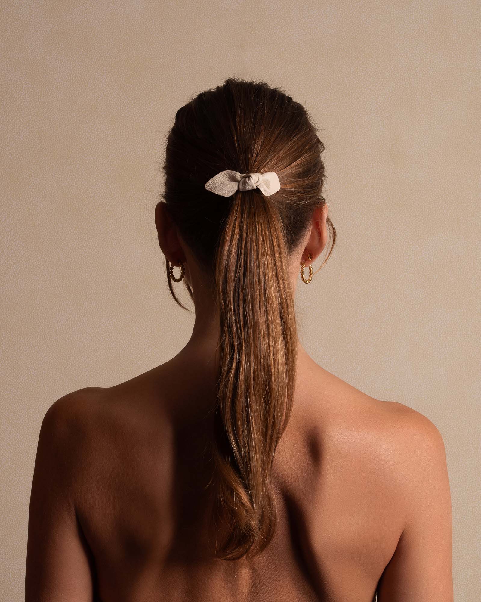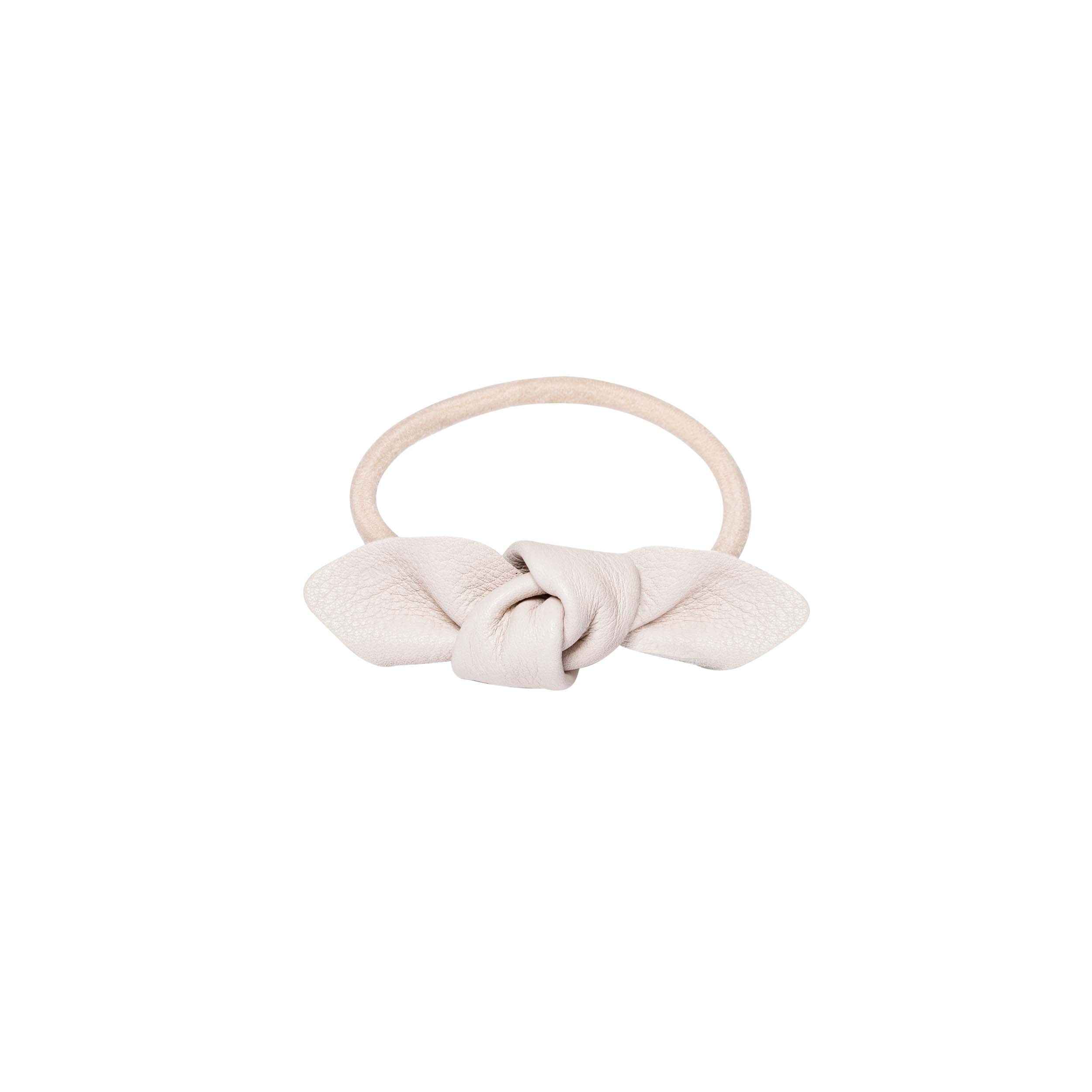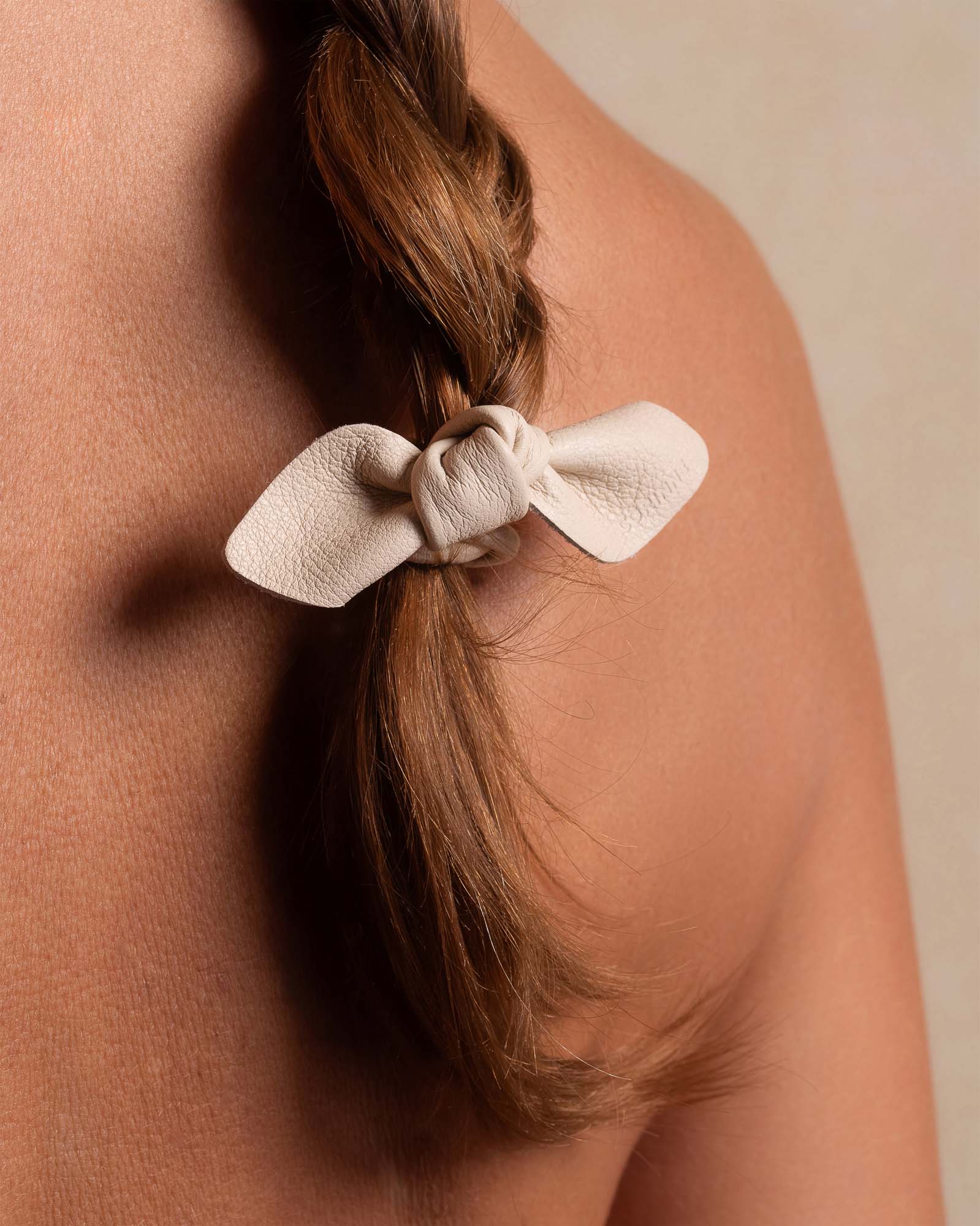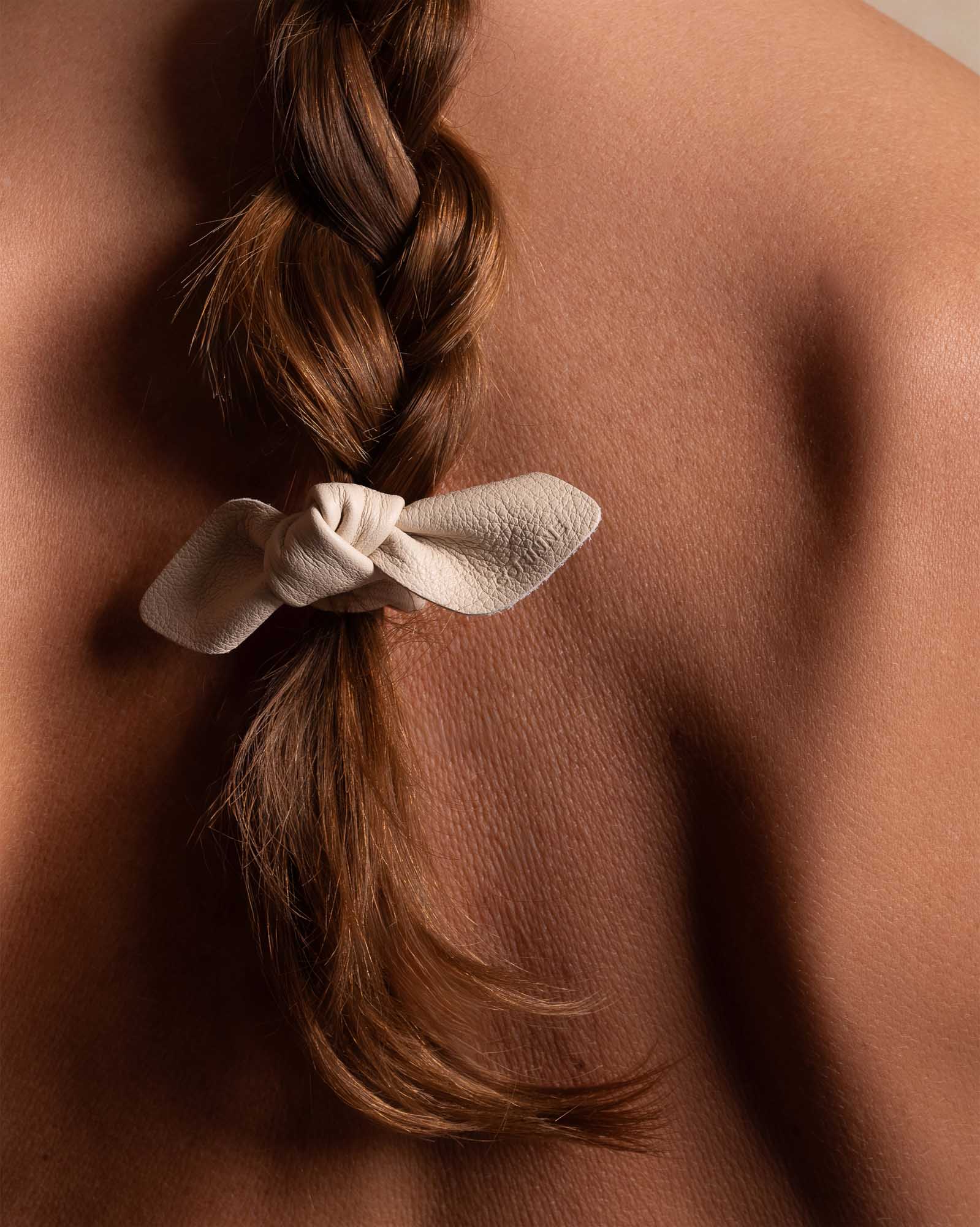 Crafted from high-quality leather, this small hair tie features a beautiful bow design and a cream color that adds sophistication to any hairstyle. Perfect for elevating your look, this hair tie is a must-have for any fashion-forward individual.