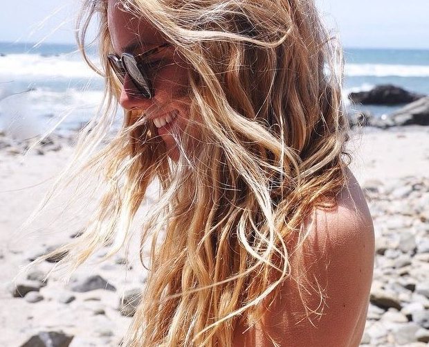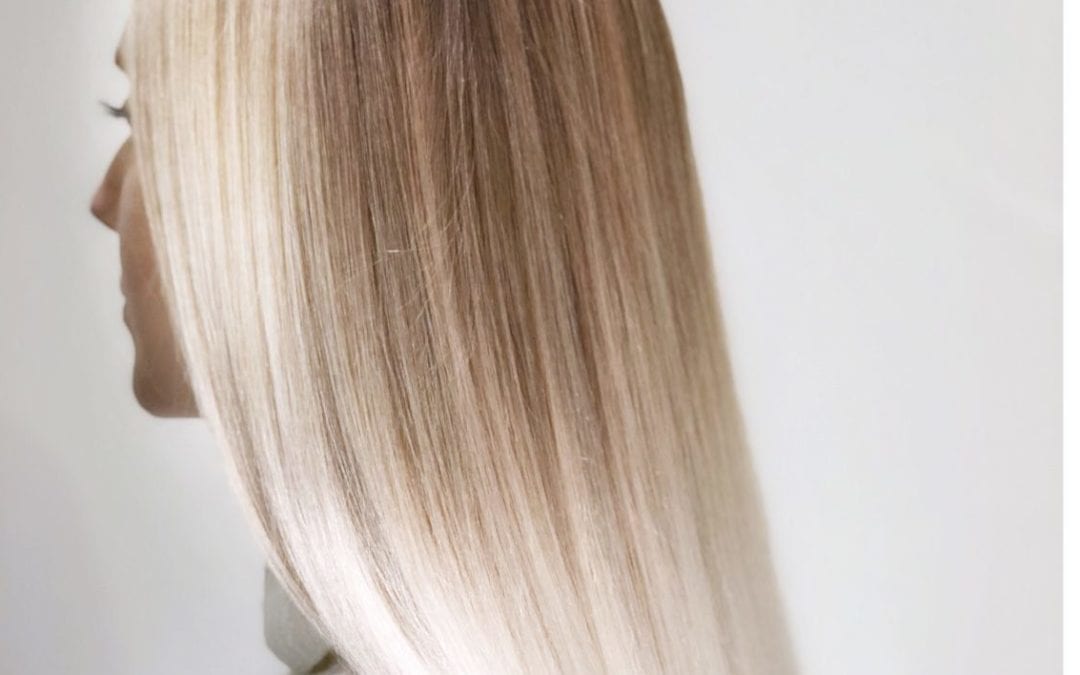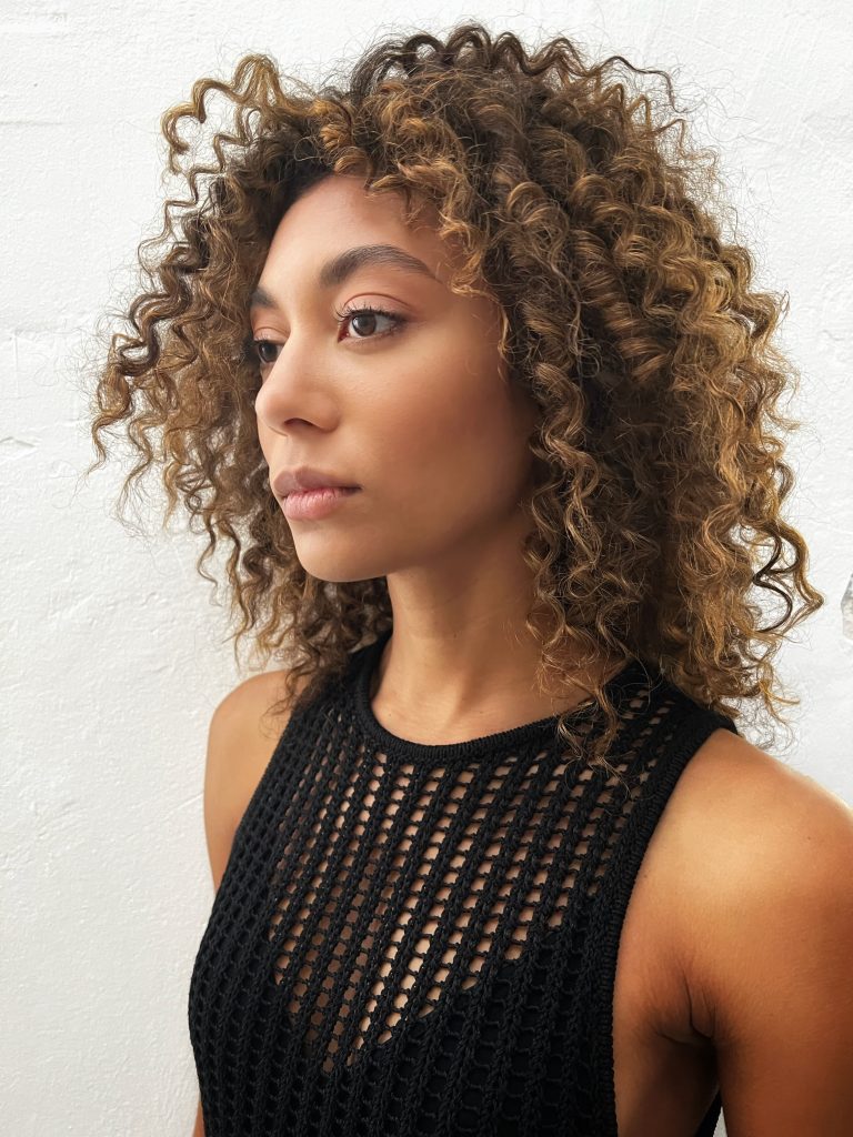 The key to making it look super chic and almost “kissed by the sun” is to work with ribbons of golden and cream blonde pieces throughout the hair in a seamless application, glossed with a brown hair colour in-between to create seamless contrast and dimension.